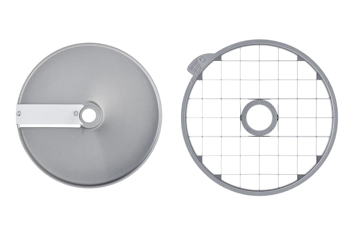 комплект 28115W: диск 28133W + решетка 28122, Устанавливается в рабочий отсек овощерезки на вал двигателя, используется для моделей CL50, CL50 Ultra, CL52, CL55, CL60, CL60 V.V., R502, R502 V.V., R752, R752 V.V., изготовлен из алюминия с покрытием Mineral+ . Используется для нарезки картофеля, кабачков, репы, картофеля фри, дыни, арбуза на кубики размером 25х25х25 мм.