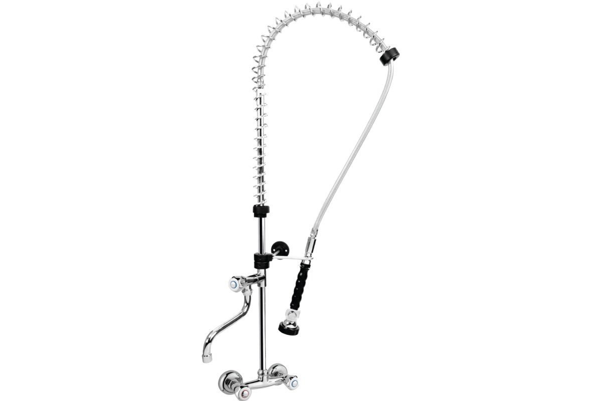 Устройство душирующее с промежуточным краном для предварительного ополаскивания MT04 ECO - имеет гибкий шланг, вращающийся в разных направлениях и крепящийся к моечной ванне и к стене.