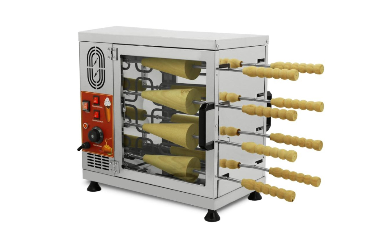 Профессиональное оборудование для приготовления традиционных чешских десертов – трдельников. Аппарат предназначен для интенсивного использования в условиях высоких нагрузок на предприятиях общественного питания, в специализированных киосках и ресторанах. Он обеспечивает равномерное выпекание трубочек с идеальной хрустящей корочкой и нежной внутренней структурой, что позволяет предлагать гостям аутентичный продукт высшего качества.
