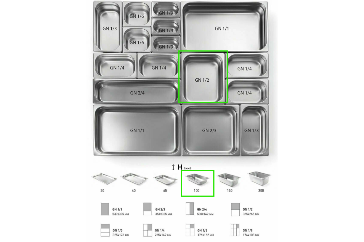 - Стандарт GN 1/2 (325x265 мм) — емкость занимает половину стандартной гастроемкости или полки стеллажа, что позволяет гибко комбинировать ее с другими размерами (GN 1/1, GN 1/3) для максимально рационального использования ценного пространства в холодильниках, на линиях раздачи и в печах.