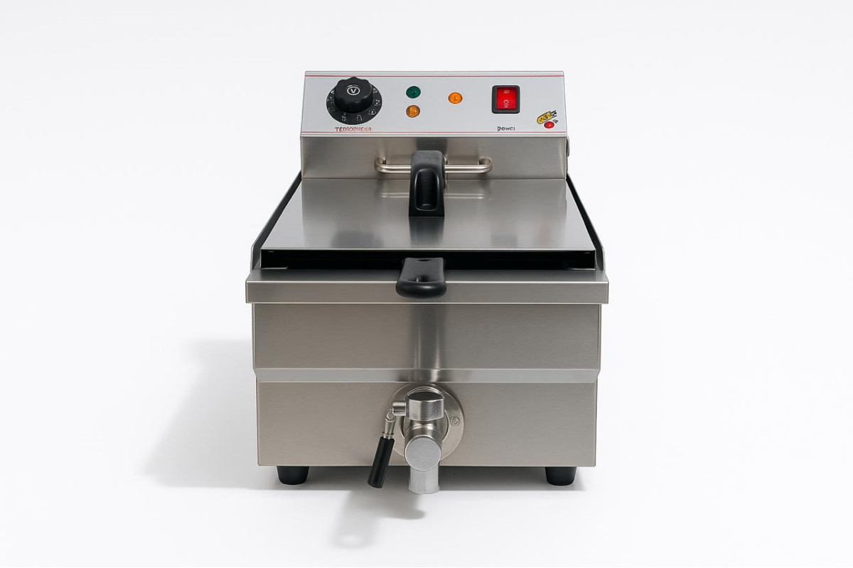 - Кран для слива отработанного масла — решает главную проблему обслуживания: обеспечивает быстрый, чистый и безопасный слив без необходимости наклонять или перемещать тяжелый аппарат. Это экономит время персонала и повышает безопасность на кухне.