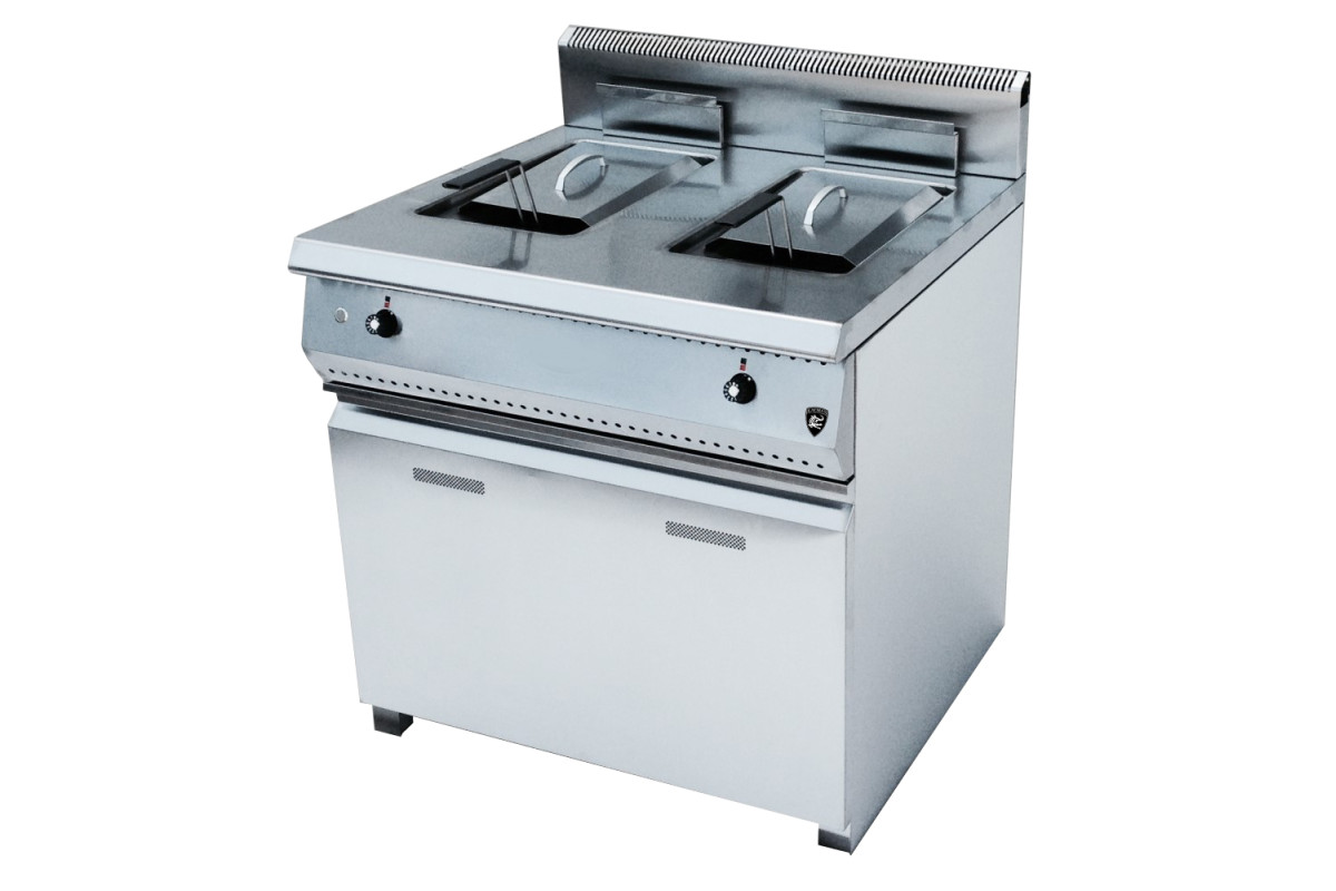 840х800х1050мм, газовая фритюрница 800 линии на закрытом стенде с дверцами, 2 фритюрные ванны max 13+13 литров/рабочий 6+6 л 2 корзина, 2 специальные горелки, с электророзжигом, полный газконтроль, 2 газовых термостата плавно регулирующих температуру масла от +40-190С, газовая мощность 21,4 kW, г.нетто , 100кг, г.брутто: 1000х950х1340, 130кг. полностью из н/стали
