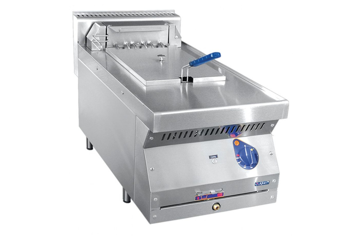 - Все регуляторы и функциональные элементы расположены на передней панели. Фритюрница оснащенадвумя термостатами: регулятор температуры и аварийный, который блокирует выключение нагревательных элементов при отсутствии масла.