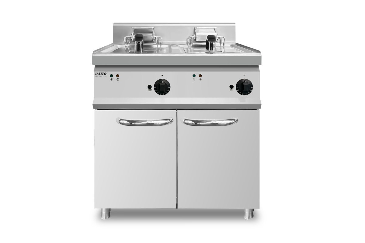 Фритюрница электрическая на закрытой подставке MK-EFR7C182 с двумя ваннами 18х18 л. Габариты: 800х700х900 мм. 20 кВт, 380 В. Поставляется с корзинами. Материал: нержавеющая сталь.
