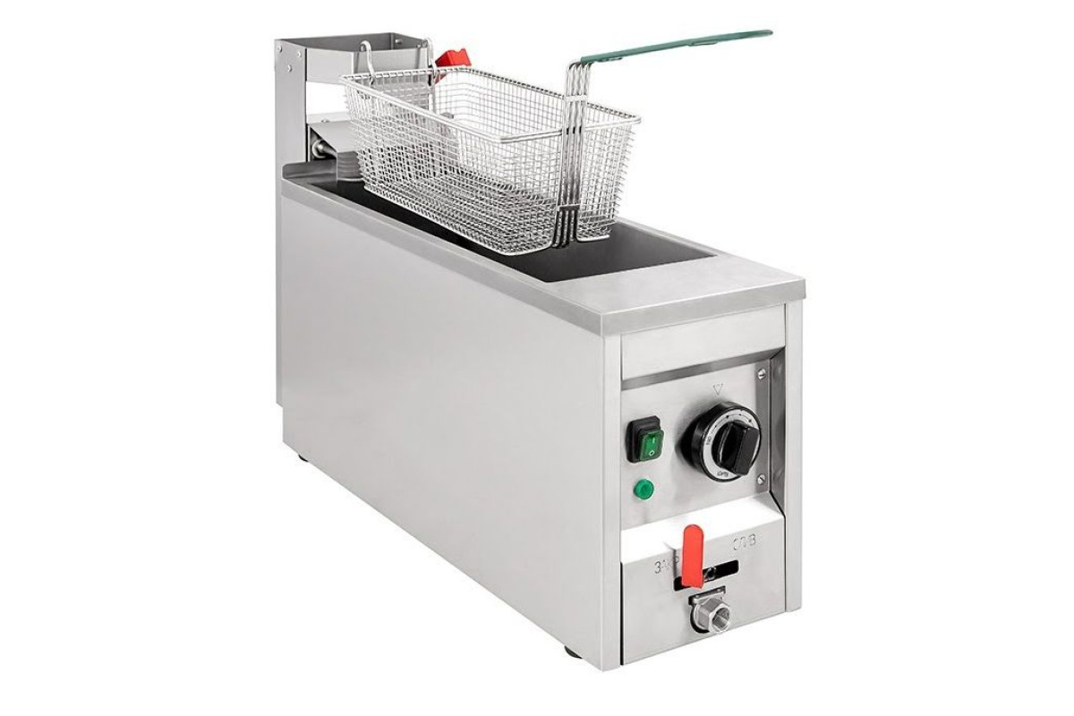 Фритюрница электрическая настольная с одной ванной объёмом 12л. Ванна имеет холодную зону для сгоревших частичек продукта. В комплекте корзина из нерж. стали. Фритюрница оснащена механизмом поднятия ТЭНов. Общий объём ванны – 15 литров. Объем масла – 12 литров Конструкция изготовлена из нерж. стали AISI 430.