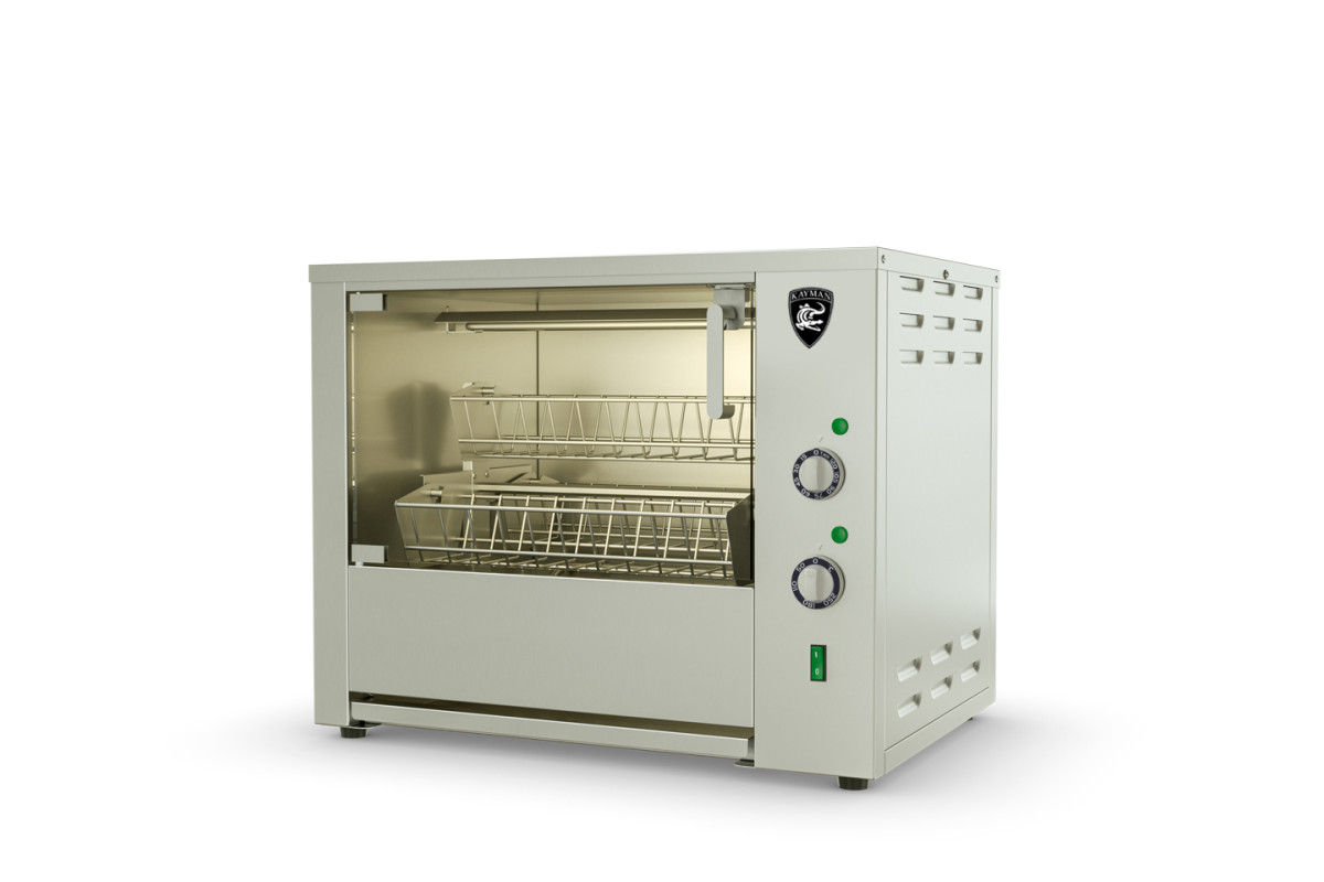 Заказ от 5шт. 630х465х505мм, AISI430, 3,6кВт, 220В, +50...+250С, карусельный, 4 садка, на 8 кур, таймер 15-120мин. Предназначен для жарки тушек кур, цыплят, куриных окорочков, грудок и других продуктов. Время приготовления при полной загрузке камеры 60-70 мин. Корпус гриля изготовлен из пищевой нержавеющей стали AISI430. Гриль карусельного типа загрузкой до 8 кур. Куры размещаются внутри гриля на четырех легкосъемных садках (люльках), изготовленных из нержавеющего прутка. Садки вращаются вокруг центральной оси внутри рабочей камеры. Механизм торможения позволяет четко фиксировать положение садков во время остановки вращения, исключая проворот при несимметричной загрузке. Приготовление продуктов осуществляется посредством инфракрасного излучения ТЭНов, расположенных на передней, задней и верхней частях рабочей камеры. Каждый ТЭН имеет отражатель, повышающий эффективность нагрева продукта. Интенсивность нагрева плавно регулируется терморегулятором, ручка которого расположена на передне