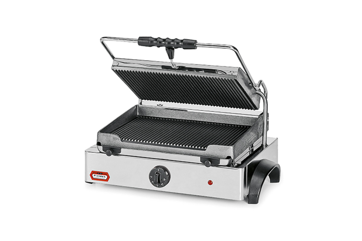 Чугунные жарочные поверхности (рифленые) — обе плиты (верхняя и нижняя) выполнены из чугуна с рифленой структурой. Чугун долго держит температуру, не деформируется при перепадах нагрева и создает аппетитные «гриль-полоски» на мясе и овощах. Рифление позволяет лишнему жиру стекать, делая блюда менее жирными, а корпус — более хрустящим.