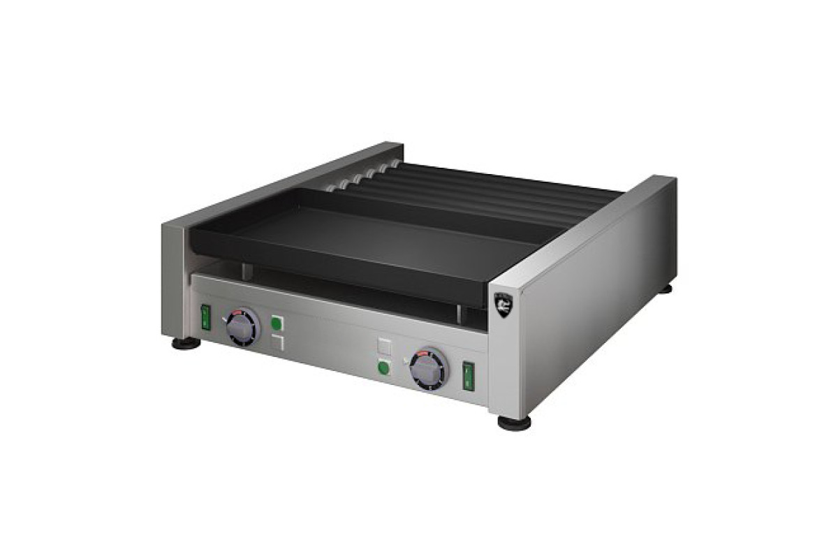 Заказ от 5шт. 536х362х170мм, 1,2 кВт, 220В, ролики из черной стали с антипригарным покрытием 8шт., длина ролика 450мм, кол-во одновременно приготавливаемых сосисок 7-21шт., время приготовления при полной загрузке около 8-14мин, время разогрева роликов до максимальной температуры 10 мин. Скорость вращения роликов 2 об/мин. Под роликами установлен поддон для сбора жира. Масса 11кг.