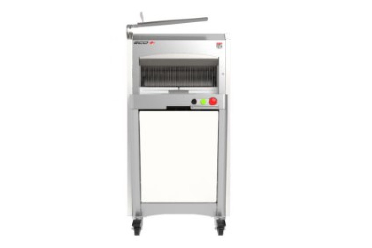 604*745*1337мм, 0,49кВт, 220В, максимальные размеры хлеба 440х310х160мм, стальной нож 13*0,5мм, толщина ломтя от 9 до 18мм, высота толкателя 80мм, задняя защитная крышка. Съемный бак для сбора крошек емкостью 18л. Возможное цветовое исполнение по запросу: красный, бежевый, черный, серый металлик, белый