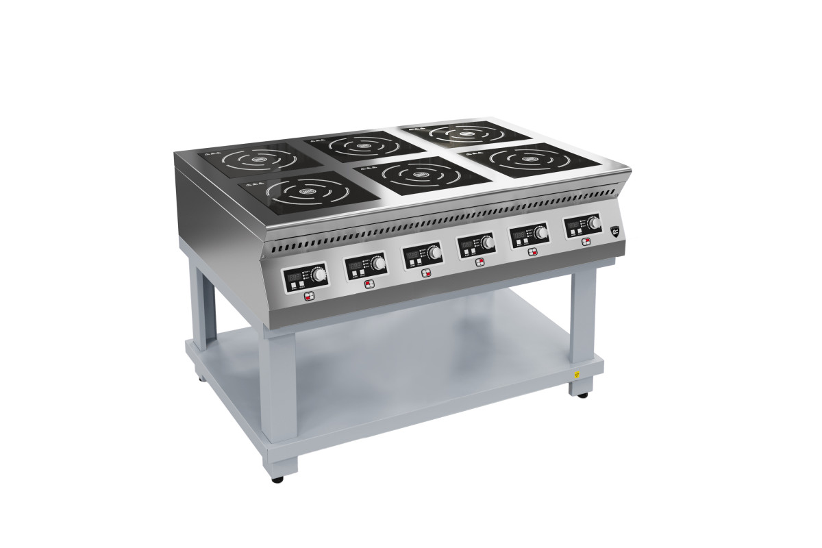 1220х850х860мм, стеклокерамика 6 мм, 6 независимых индукторов мощностью 5кВт, 9 ур. мощности, +60…+240 С, 30 кВт, 400 В, 900 серии, без воздуховода, на крашеной подставке;