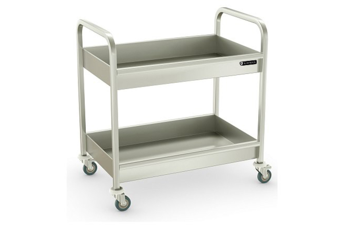 850х530х900мм, кол-во уровней 2шт., высота бортика полки 100мм, расстояние между уровнями 450мм, нагрузка общая 100кг, нагрузка на одну полку 50кг. Материал полки, направляющих AISI304 0,8мм, материал стоек AISI 304, труба 25х25мм, 2шт. опоры без тормоза, 2шт. опора с тормозом, диаметр поворотных колес 75мм. Вес 15,5мм. Сварная конструкция. К рамам приварены две полки из нержавеющей стали AISI 304. Расстояние между полками составляет 450 мм. Полки по периметру имеют герметичный бортик высотой 100 мм.