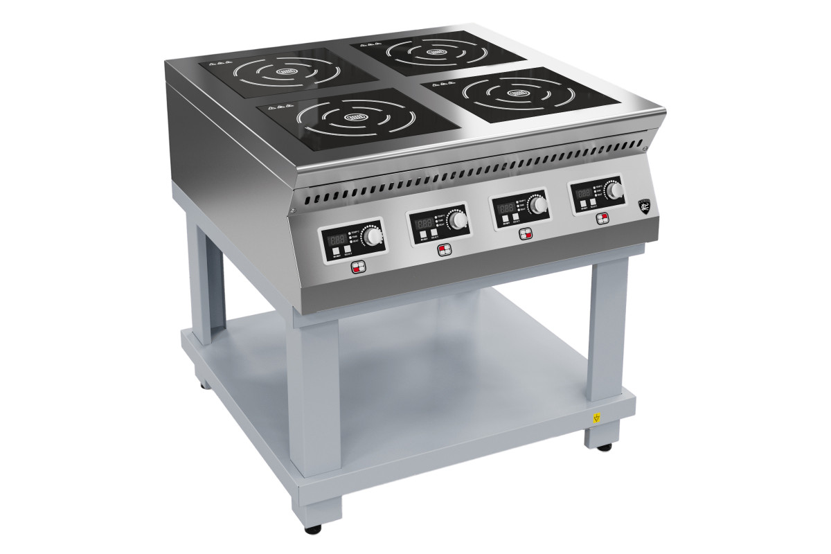 840х850х860/940мм, 4 конфорки, стеклокерамика 6 мм, 4 независимых индуктора мощностью 3,5кВт, 9 ур. Мощности ,+60..+240? С 14кВт , 400В, 900 серии, без воздуховода, на крашеной подставке,