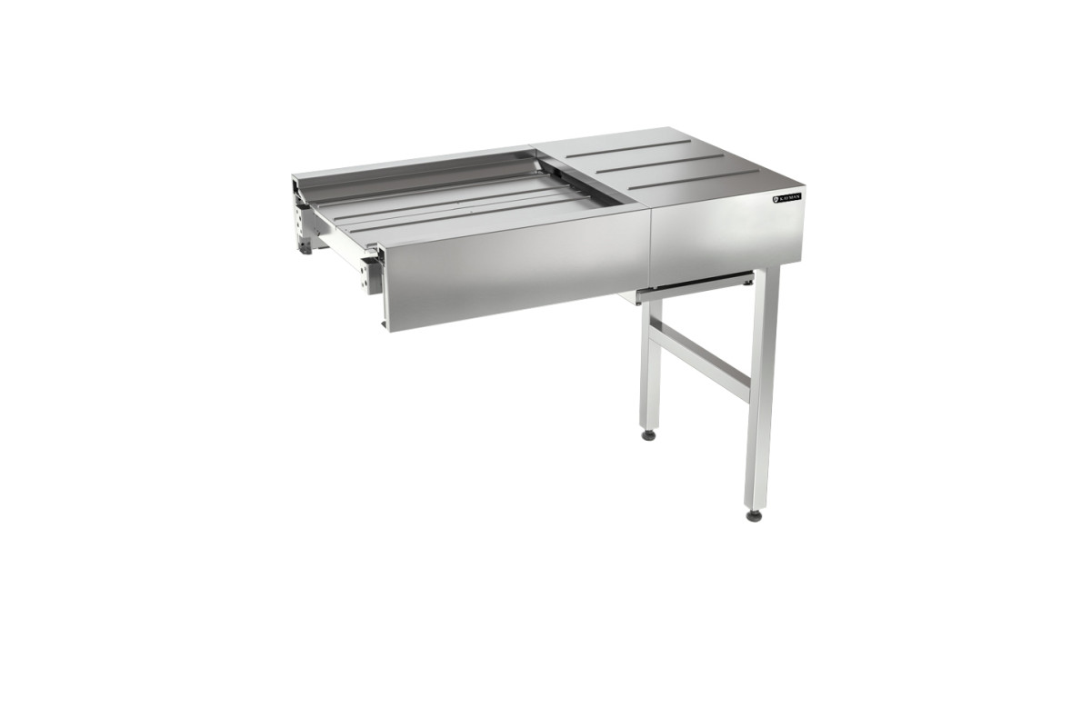 1030х600х850мм, ширина используемой ленты 450мм. Натяжной модуль представляет собой часть транспортера, предназначенную для натяжения ленты. Максимальная длина транспортера – до 20 метров. Перемещение посуды может осуществляться как поштучно, так и на подносах.