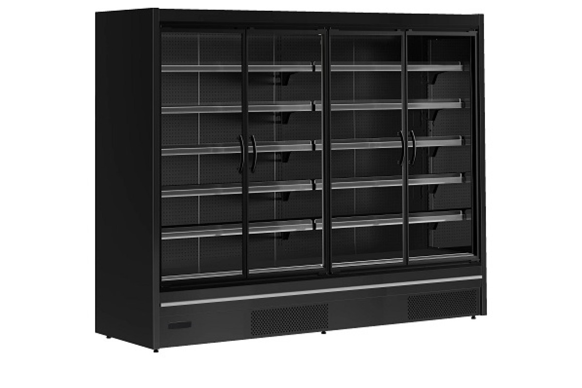 2580x805x2095 мм, 1,11 кВт, 220В, -1/+5С, объем 2098/1480 л, с встр. агр., R290, вентилируемая (динамический холод), 10 полок, размеры полок 1250x400 мм, 4 дверцы, с LED-подсветкой, цвет черный
