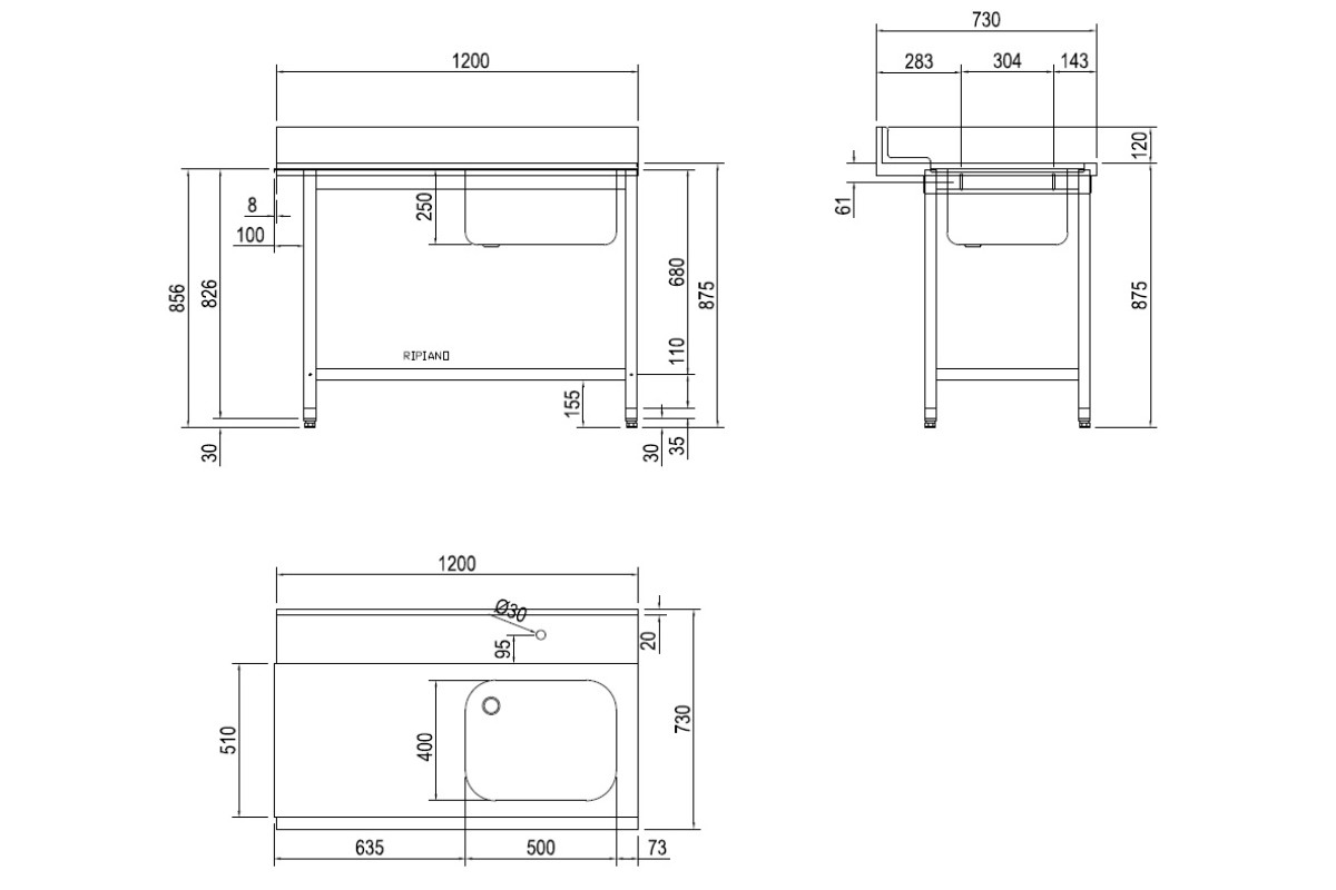 1200х730х875мм., ванна 500х400х250мм максимально справа., бортик, полка; левый.