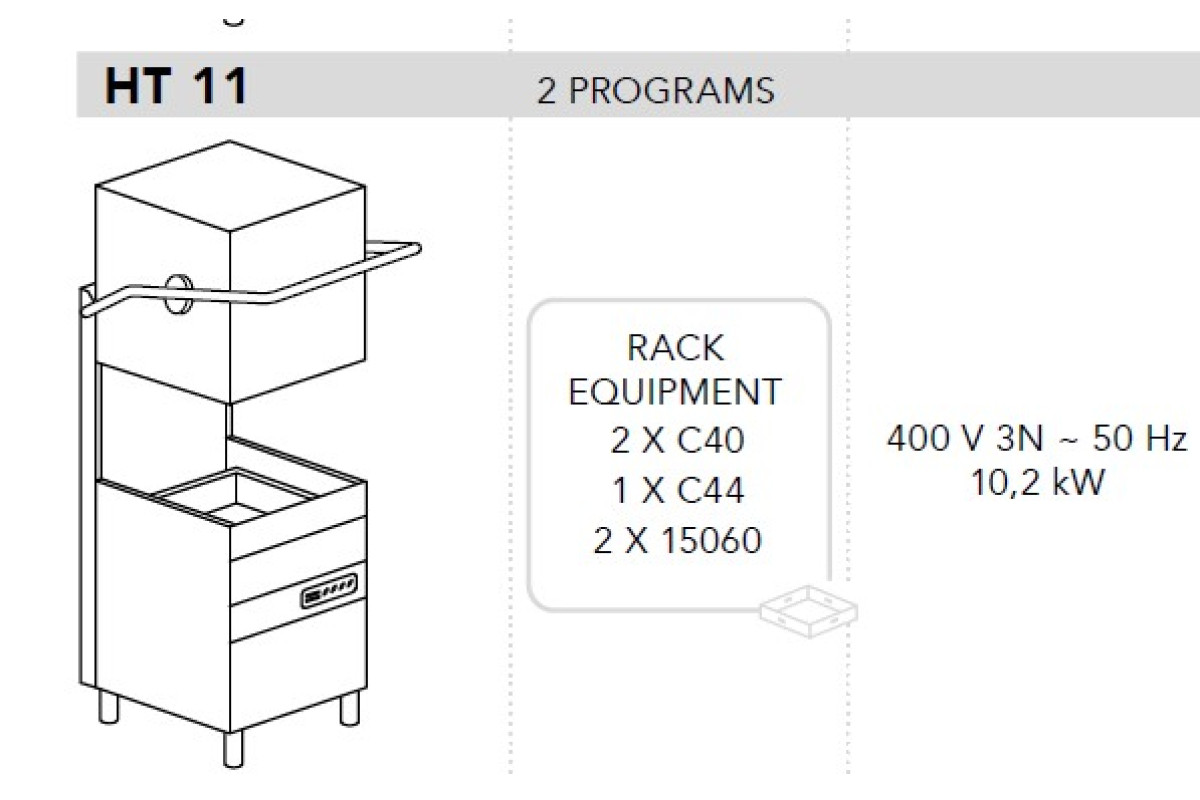 720*735*1445/1880, 380В, 10,2кВт, купол, пр-ть 70/30кас/час, кассеты 500х500мм, DDE - дозатор моющих и ополас. средств, PS - помпа слива, 2 программы, D - встроенный умягчитель воды, комплект корзин: 2 корзины C40 для тарелок, 1 универсальная плоская корзина C44, 2 подставки 15060 для столовых приборов, для мойки тарелок до 410 мм и гастроёмкостей GN 1/1 530x325 мм, пуск/остановка при закрывании/открывании купола