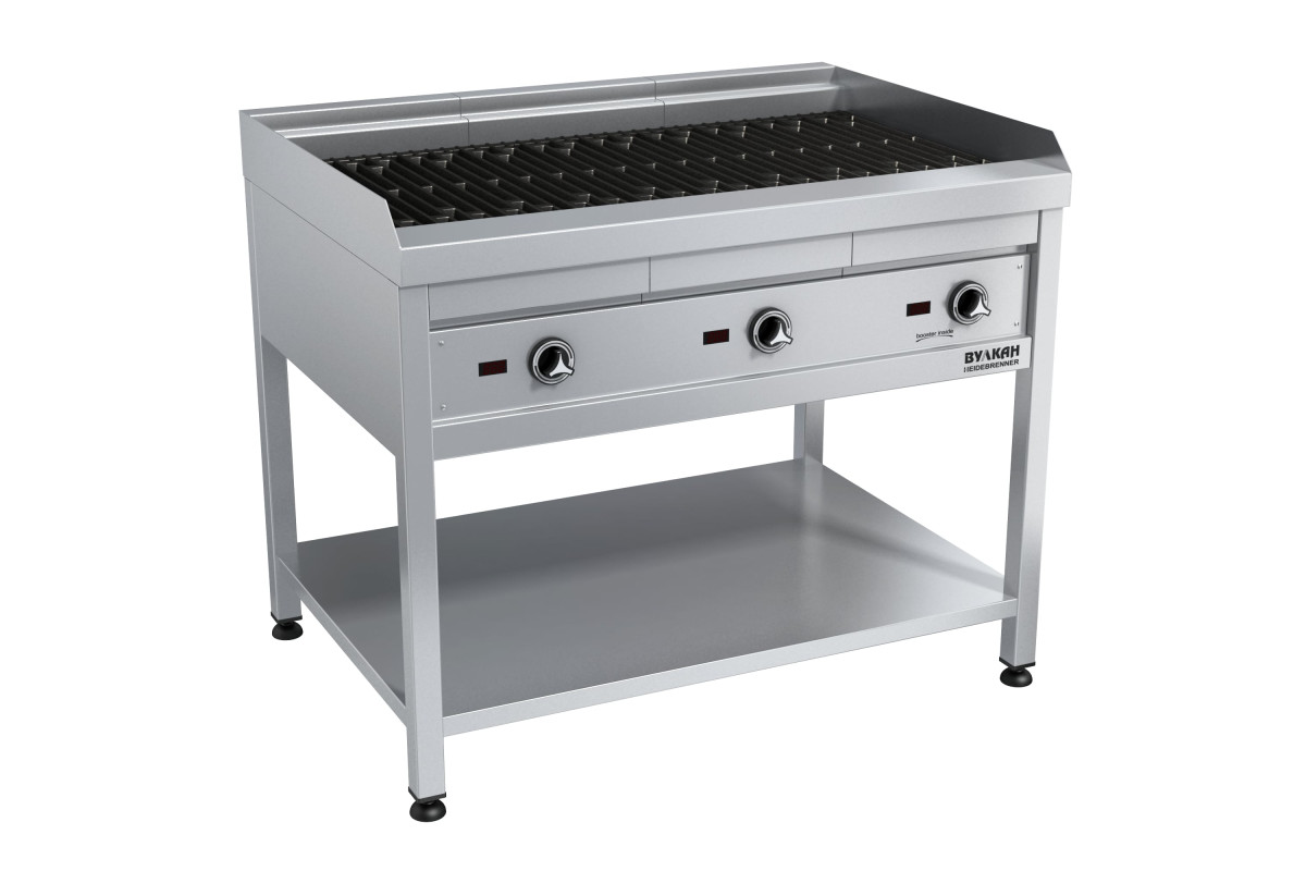 1000х700х850мм, Напольный лавовый гриль из нержавеющей стали с 3-мя зонами нагрева. Особенность этого гриля – наличие лавовых камней, долго держащих тепло и выполняющих роль раскаленных углей. Капли жира, попадая на камни, образуют лёгкий дымок, придающий мясу неповторимый вкус. Добавив на камни немного древесной стружки, вы получите продукт с тонким ароматом копчения. Важная деталь гриля – чугунная решетка, обладающая отличными антипригарными свойствами и придающая продукту характерный рельефный рисунок, 3х4,5кВт, 380В, Брутто: 166кг