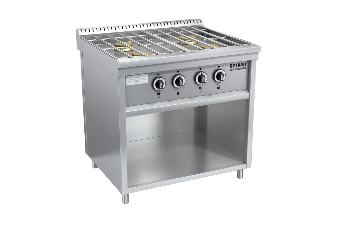 800х700х850мм, Плита из нержавеющей стали с 4-мя горелками по 6 кВт, съёмной решеткой из нержавеющей стали, В нижней части плиты имеется ниша для хранения кухонного инвентаря, газконтроль, работа на природном или сжиженном газе, герметичная столешница, ножки плиты регулируются по высоте, 4x6,0кВт, Расход газа: прир (сжиж)-2,44 (1,90)м3?ч (кг/ч), Брутто: 88кг