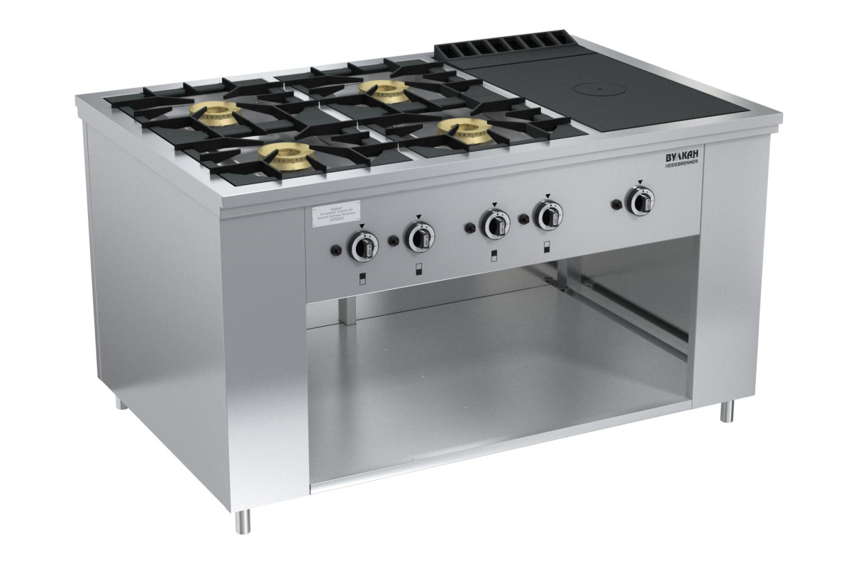 1470х990х850мм, Плита из нержавеющей стали с 4-мя двухрядными горелками и варочной чугунной поверхностью. Открытые горелки имеют массивные чугунные решетки размером 430х430 мм, что позволяет размещать на них гастроемкости объемом до 50 л, съёмная подконфорочная емкость. Под чугунным настилом располагается мощная горелка, быстро и равномерно нагревающая всю поверхность рабочей зоны, благодаря чему на нем можно разместить как крупные гастроемкости, так и множество мелких. В нижней части плиты имеется ниша для хранения кухонного инвентаря. Газконтроль, запальные горелки, пьезоподжиг каждой горелки, работа на природном или сжиженном газе. Ножки плиты регулируются по высоте, 4х8,0кВт+1х10,0кВт. Расход газа: прир (сжиж)-4,37 (3,40)м3?ч (кг/ч)