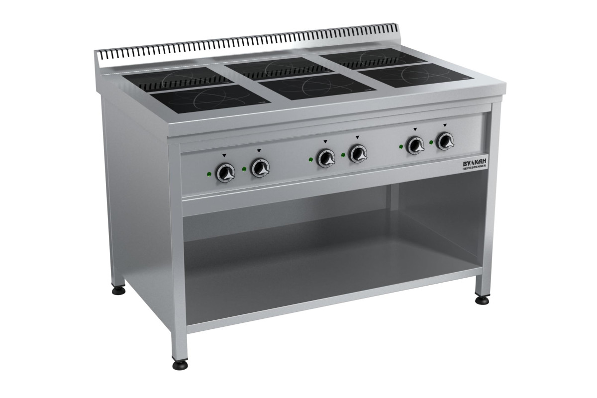 1200х700х850мм, Индукционная напольная плита из нержавеющей стали имеет 6 мощных конфорок по 5кВт, выполненных из прочного стекла SCHOTT CERAN или EURO KERA. Мощность регулируется чувствительным 16-позиционным переключателем. Оснащена умной системой распознавания посуды, 6х5кВт, конфорка: 310х270см, толщина-4мм, питание: 380В