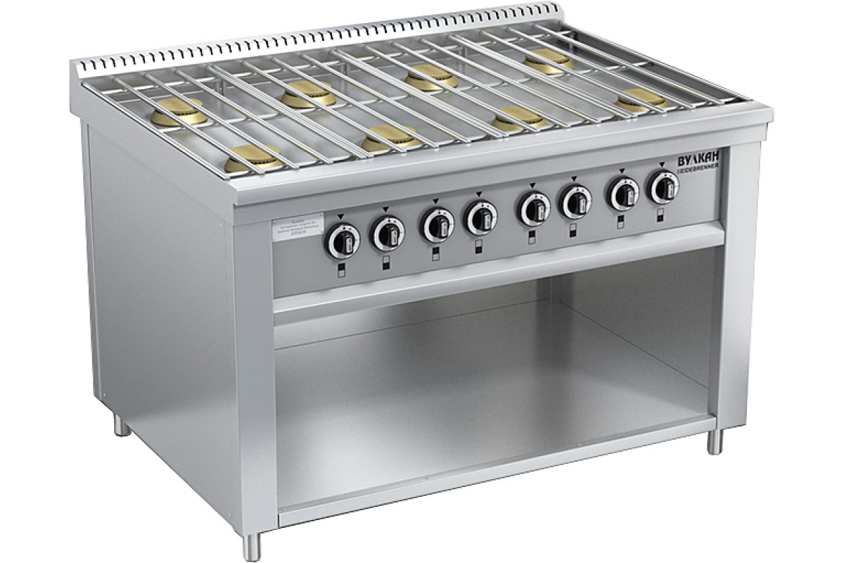 1200х700х850мм, Ультратонкая настольная газовая плита из нержавеющей стали, Возможно одновременное размещение 8 кастрюль объемом 30 л, 8 латунных горелок по 6 кВт каждая, 4 съёмных решетки из нержавеющей стали, газконтроль, работа на природном или сжиженном газе, 8х4,0кВт, Расход газа: прир (сжиж)- 3,25 (2,53)м3?ч (кг/ч) Брутто: 63кг