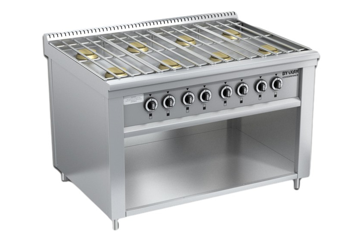 1200х900х850мм, Плита из нержавеющей стали с 8-ю горелками по 6 кВт, съёмной решеткой из нержавеющей стали. В нижней части плиты имеется ниша для хранения кухонного инвентаря, газконтроль, работа на природном или сжиженном газе, герметичная столешница, ножки плиты регулируются по высоте, 8x6,0кВт. Расход газа: прир (сжиж)-4,87 (3,79)-м3?ч (кг/ч), Брутто: 118кг