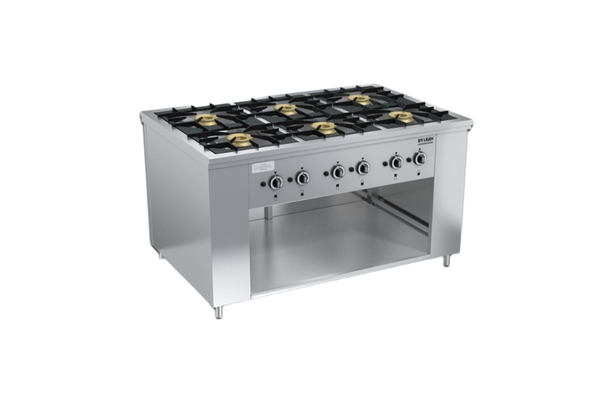 1470х990х850мм, Профессиональная газовая плита с 6-ю мощными двухрядными горелками, изготовленными из латуни. Открытые горелки имеют массивные чугунные решетки размером 430х430 мм, что позволяет размещать на них гастроемкости объемом до 50 л, съёмная подконфорочная емкость, Съёмная подконфорочная емкость и корпус из высококачественной нержавеющей стали, ниша для хранения кухонного инвентаря, система газконтроля, пьезоподжиг,