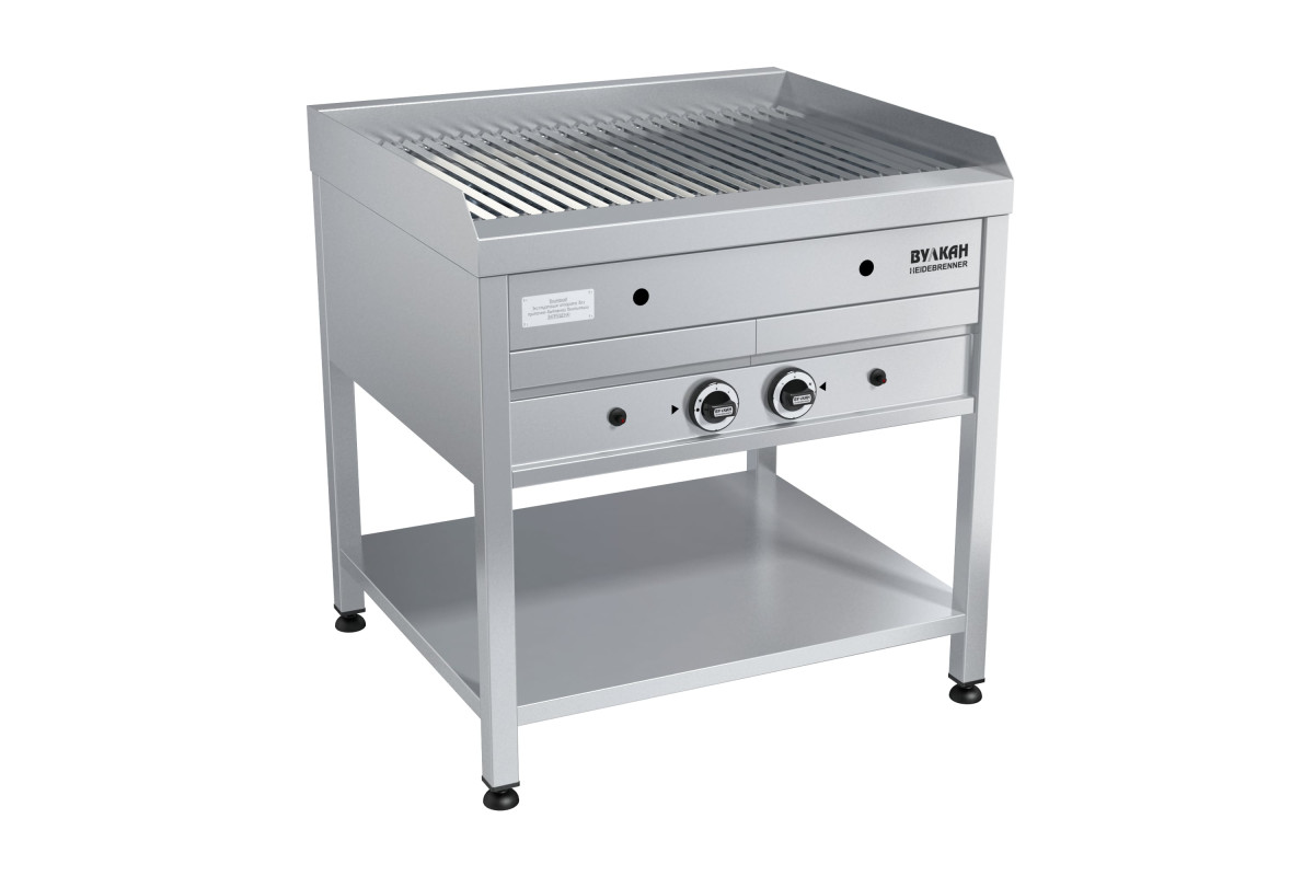800х700х850мм, Гриль газовый напольный из нержавеющей стали. 2 мощные горелки нагревают лавовые камни. Капли жира, попадая на раскаленные камни, образуют лёгкий дымок, придающий мясу неповторимый вкус. Добавив на камни немного древесной стружки, вы получите продукт с ароматом копчения. Специальная V-образная решетка задерживает излишки жира, выделяющиеся при жарке. Лавовые камни долго держат тепло, позволяя готовить большое количество блюд. Газконтроль, запальная горелка, пьезоподжиг каждой зоны, поддон для сбора жира, работа на природном или сжиженном газе, 2х12,1кВ. Расход газа: прир (сжиж)-2,46 (1,91)м3?ч (кг/ч)