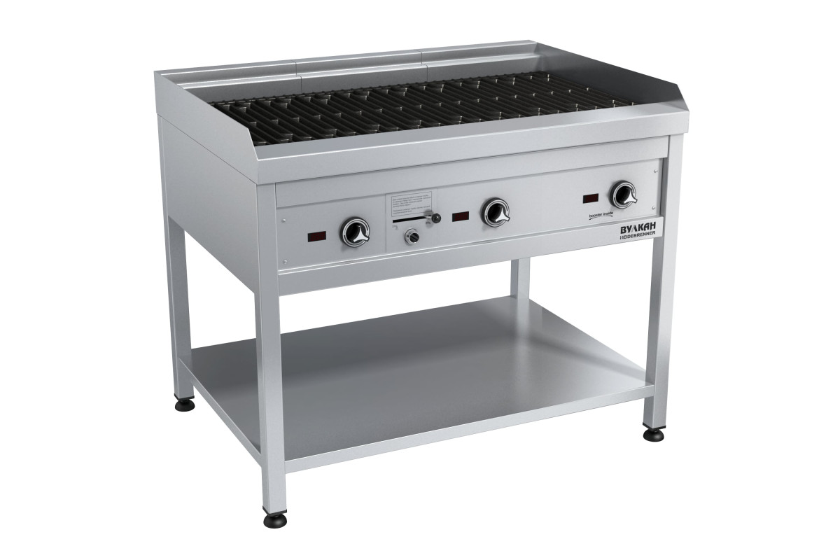 1000х700х850мм, Напольный водяной гриль из нержавеющей стали с 3-мя зонами нагрева. Отличительная черта водяного гриля – наличие поддона с водой. Испаряющаяся вода создает эффект водяной бани, благодаря чему продукты не только равномерно прожариваются, но и приобретают необыкновенную сочность и мягкость. Использование воды также существенно снижает образование дыма и чада. Для качественной прожарки и получения рельефного узора используются НЕРЖ решетки, , 3х4,5кВт, 380В