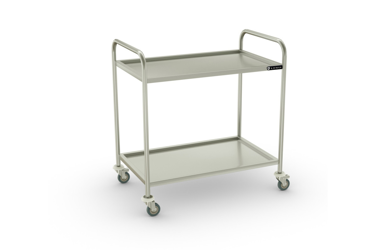 850х530х900мм, кол-во уровней 2, высота бортика полки 20 мм. Расстояние между полками 570мм, величина углубления в полке 15мм, общая нагрузка 40кг, нагрузка на одну полку 20кг, материал полки AISI430 0,8мм, материал стоек AISI 201 1,5мм труба диаметр 25мм. Опоры без тормоза 2шт., опоры с тормозом 2шт., диаметр поворотных колес 75мм. Вес 14кг. Разборная конструкция. Стойки выполнены из труб круглого сечения и соединены между собой полками с углублением 15мм.