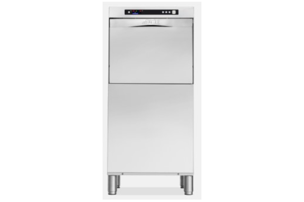 590x600x1290, 380В, 6,9кВт, кассета 500х500, 4 программы 53/40/30/20 кас/час, T - сенсорная панель управления, двойная дверь, ванна с наклоном для полного слива, Thermostop - ополаскивание начинается только при достижении t 85 градусов, обтекаемая форма крышки от падения капель, легкие моечные и ополаскивающие рукава - эффективны при низком напоре воды