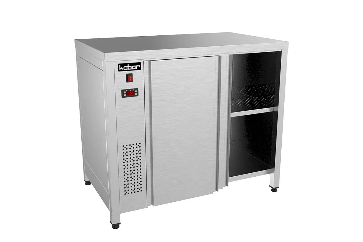 Стол тепловой без борта, двери-купе, корпус н.с. AISI 430, перф. полка регулируемая по высоте, регулируемые по высоте ножки, электронная реулировка температуры до 60С, объем 390л, 220В, 2кВт, 90кг