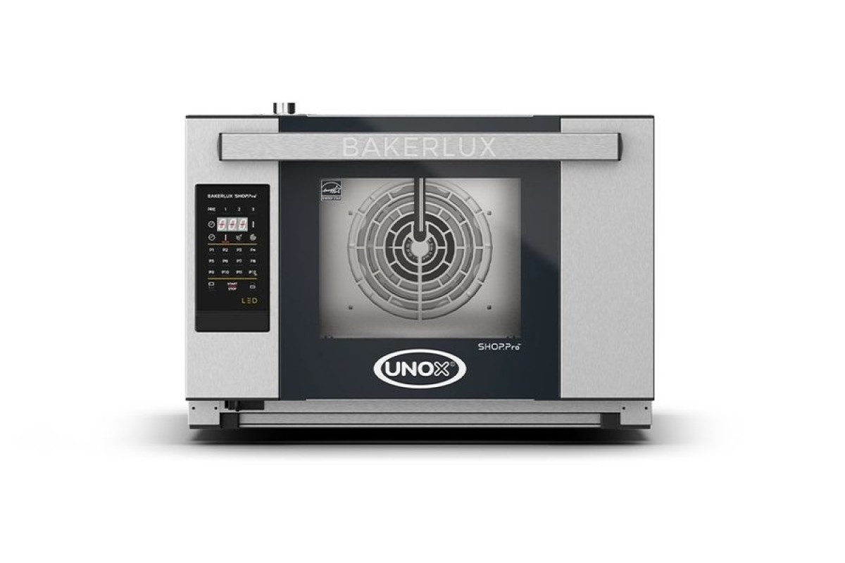 Конвекционная печь для выпечки, с пароувлажнением, 3 уровня 460x330, расстояние между уровнями 75мм. Сенсорная панель управления LED, 99 ячеек для программ, 3 шага выпекания, 2 скорости вентилятора. Регулируемое пароувлажнение (шаг 20%). Температурный режим: от 50 до 260 °C. Дверь открывается вниз.