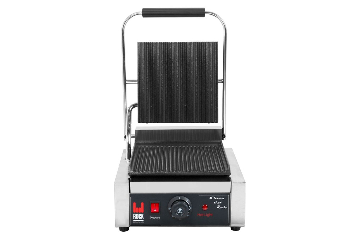 Контактный гриль, верхняя и нижняя рабочая поверхность рифленые, с антипригарным покрытием, размер поверхностей 220х230мм, разогрев до 300С, 1,8 кВт, 220 В