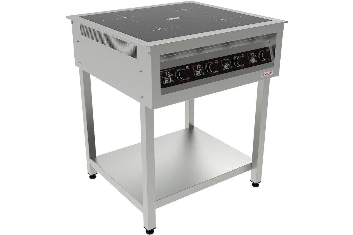 Плита индукционная на открытой подставке, 4 конфорки мощностью 4х3,5кВт, электронная панель управления с цифровой индикацией, 13 уровней нагрева, таймер до 180мин., корпус из н.с. AISI 430, регулируемые по высоте ножки, рабочая поверхность - стеклокерамика, 14 кВт, 380В, 43кг