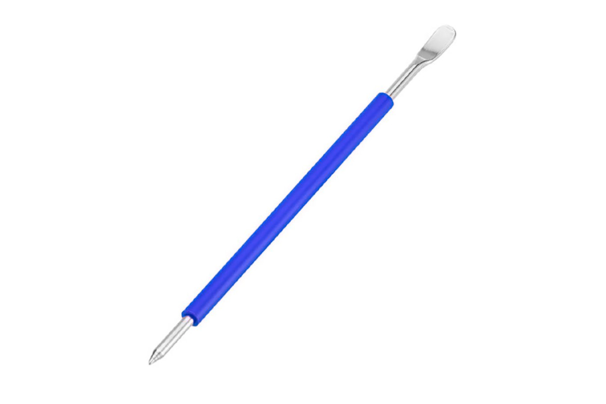 Ручка для латте-арта (этчинга) из нержавеющей стали с удобной нескользящей поверхностью синего цвета. С одной стороны ручки находится острый наконечник, позволяющий аккуратно и точно прорабатывать детали рисунка, а с другой - удобный мини-шпатель, с помощью которого удобно выкладывать молочную пену на поверхность чашки с кофе. Гарабриты: 5х5х150 мм. Не использовать в посудомоечной машине.