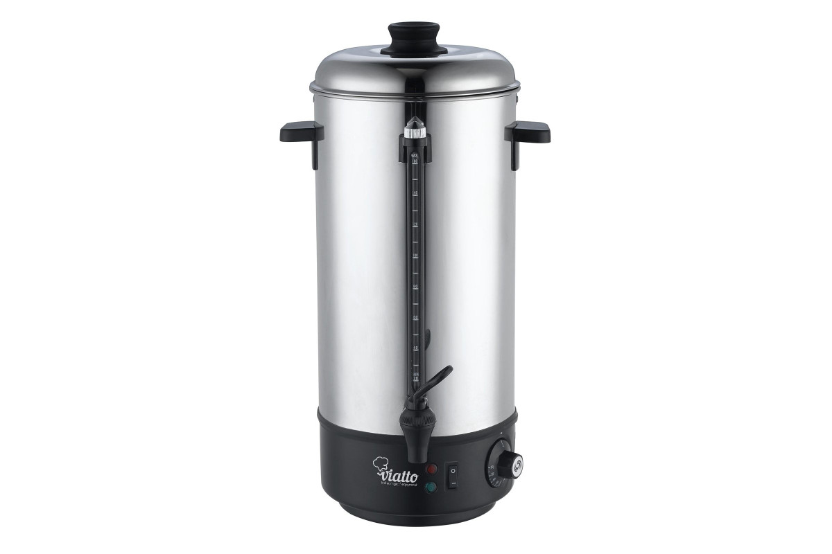 Кипятильник VIATTO MK-WB16 настольный заливной электрический. Комбинированный корпус — из нержавеющей стали и пластика. Закрытый нагревательный элемент. Одинарные стенки. Мерное стекло позволяет отслеживать уровень воды. Терморегулятор дает возможность установить температуру в пределах +30...+100С.