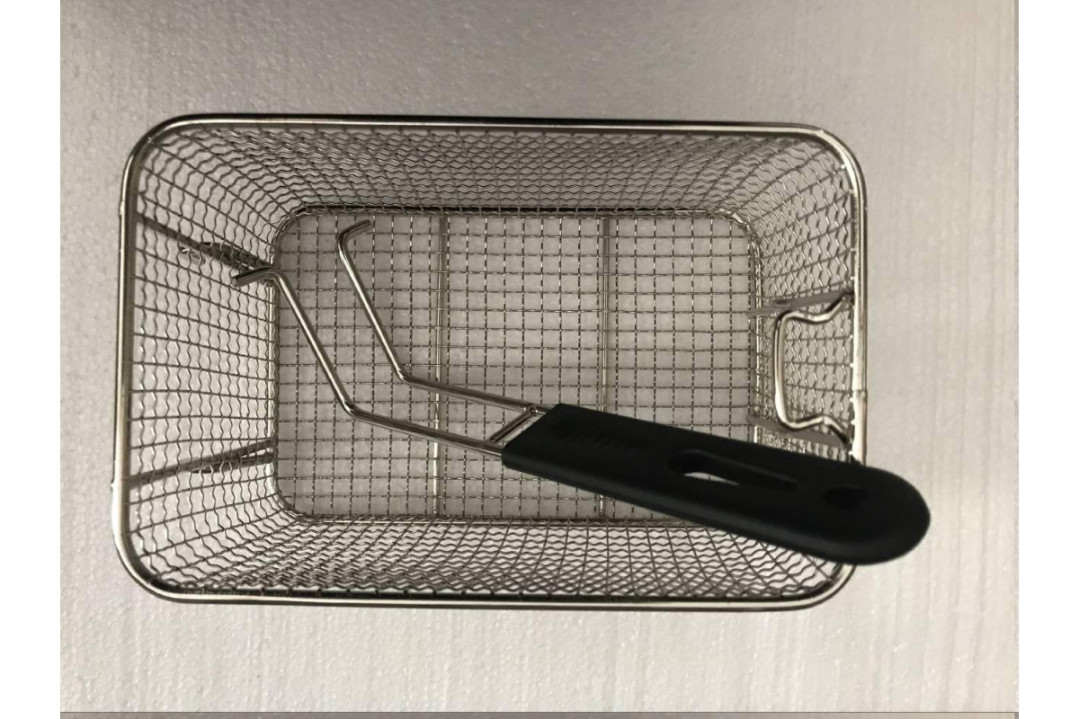 Корзина выполнена в виде металлической сетки прямоугольной формы с перфорацией по всей площади. Конструкция включает в себя длинную ручку из термостойкого пластика, которая крепится к стальной основе, что обеспечивает безопасность и удобство при работе с горячим маслом. Благодаря компактным габаритам (210x140x120 мм) корзина оптимально занимает пространство внутри фритюрницы.