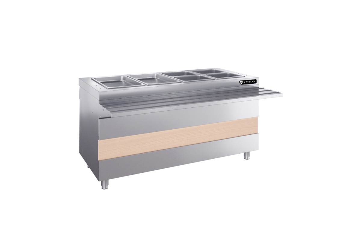 1500х1015х880 20мм,220В, 0,4кВт, t в гастроемкостях -2…+10 C. Хладагент R404a. Конструкция сборная, бескаркасная. Столешница выполнена из AISI430 и усилена листом ЛДСП 16 мм. В столешницу вмонтирована ванна 1310х510х180 мм, выполненная из нержавеющей стали. В ванну могут устанавливаться GN 1/1 максимальной глубиной 150 мм - 4шт. Чтобы установить в ванну гастроемкости GN 1/2, 1/3, в комплект поставки входят съемные перемычки из нержавеющей стали П-образной формы. t полезного объема в пределах -2C …+10C. В ванну можно засыпать чешуйчатый лед, на котором можно разместить напитки в стеклянной или пластиковой таре. В этом случае необходимо обеспечить слив растаявшей воды в канализацию. Для отвода воды, образующейся от таяния льда, на дне ванны предусмотрено сливное отверстие. Ножки модуля регулируют высоту модуля в пределах 20 мм. В комплект модуля входят направляющая для подносов (1500х315 мм) выполненная из AISI430.