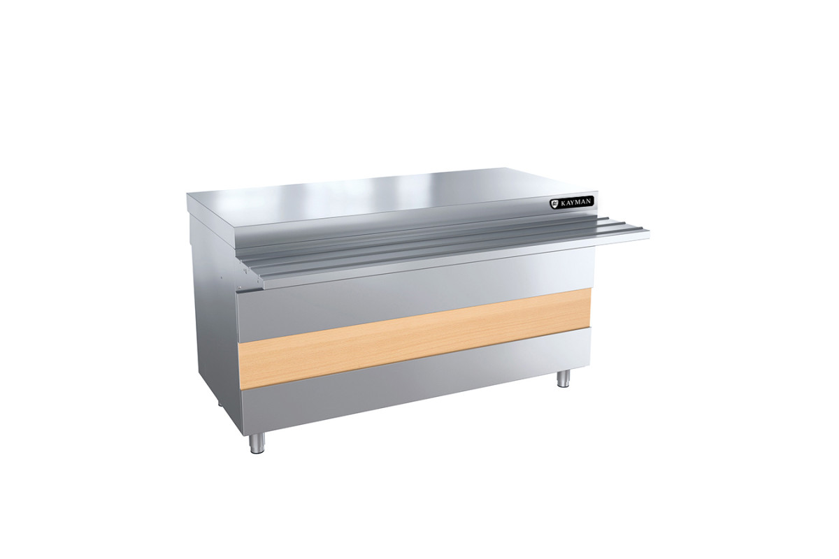 1500х1015х880 20мм. 2 розетки. Предназначен для размещения и подключения электрокипятильника.Возможна модернизация в передвижной модуль при помощи комплекта колес. Конструкция сборная, бескаркасная. Столешница выполнена из нержавеющей стали AISI430 и усилена листом ЛДСП 16 мм. Ножки модуля регулируют высоту модуля в пределах 20 мм. В комплект модуля входит направляющая для подносов (1500х315 мм) выполненная из нержавеющей стали. Вдоль всей фасадной части расположена сменная декоративная панель 1500х190 мм. В нижней части модуля со стороны обслуживающего персонала расположен отсек для хранения посуды и инвентаря. Отсек оснащен одной полкой и двумя дверями-купе. Модуль может дополнительно оснащаться светильником под направляющей.
