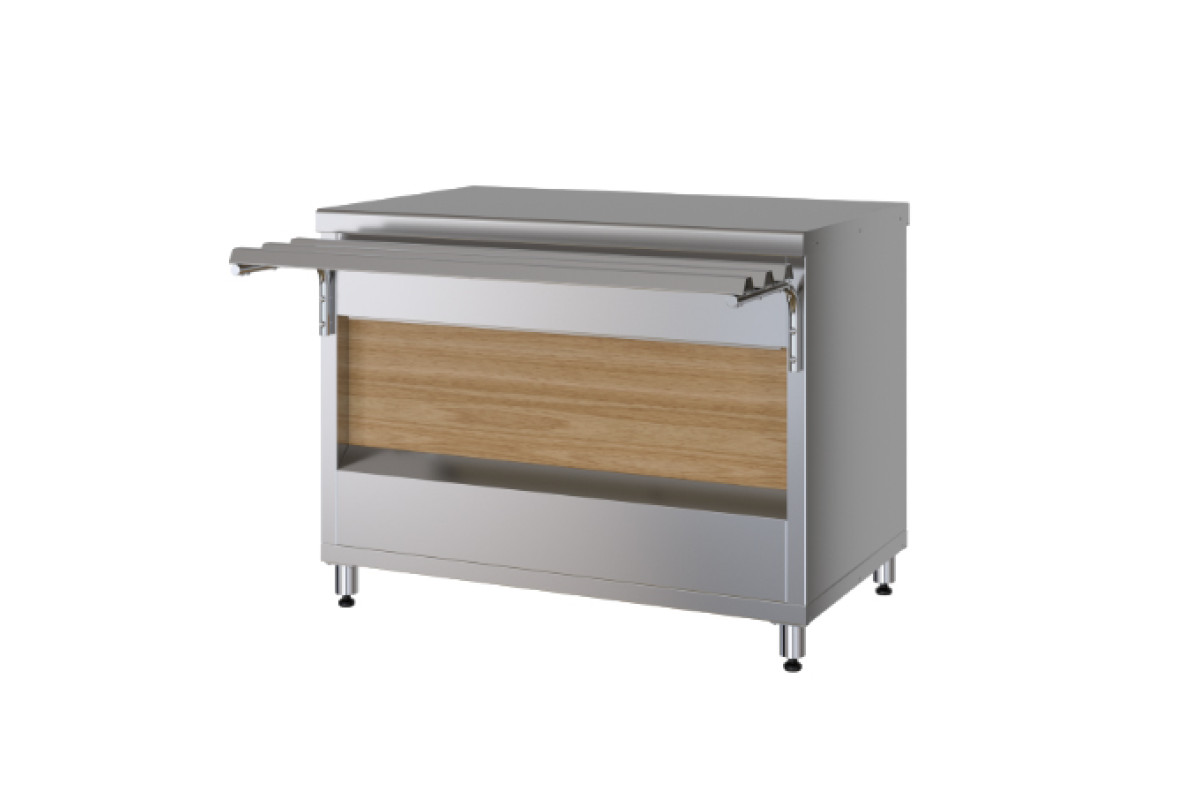 1120x705x870мм, декор деверо японский дуб. Без полок. Площадь поддонов и полок для выкладки продуктов 0,45 м2. Площадь поверхности столешницы 0,77м2. Направляющие входят в комплект.