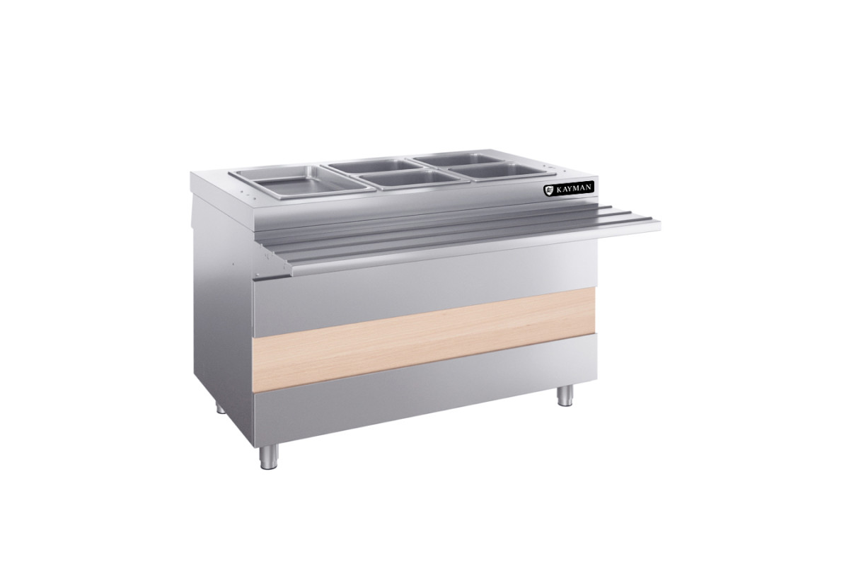 1200х1015х880 20мм, 220В, номинальная мощность подключаемого оборудования 2,42 кВт. Предназначен для поддержания в горячем состоянии гастроемкостей со вторыми блюдами, гарнирами и соусами.Конструкция сборная, бескаркасная. Столешница выполнена из AISI430 и усилена листом ЛДСП 16 мм. В столешницу установлена герметичная ванна размером 970х510х180 мм, выполненная из нержавеющей стали. В ванне расположены ТЭНы мощностью 1,2 кВт – 2шт. Тип подогрева гастроемкостей — паровой. Вода в ванну заливается сверху вручную. В ванну могут устанавливатьсяGN 1/1 максимальной глубиной 150 мм - 3шт. Чтобы установить в ванну GN 1/2, 1/3, в комплект поставки входят съемные перемычки из нержавеющей стали П-образной формы. В гастроемкостях можно поддерживать температуру max +80С. Регулировка температуры нагрева гастроемкостей осуществляется терморегулятором. Ножки модуля из нержавеющей стали, имеют пластиковую опорную часть и регулируют высоту модуля в пределах 20 мм.