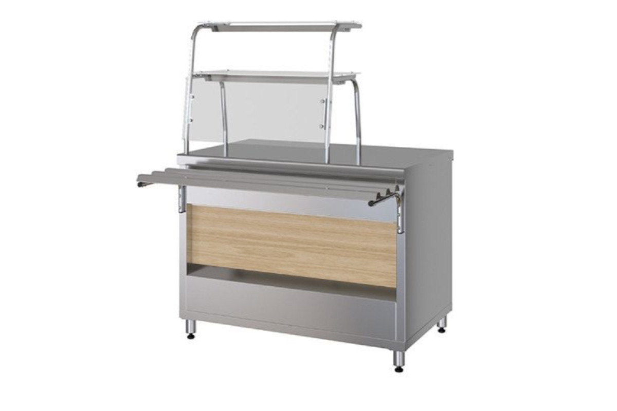 1120x705(1030)x870(1485)мм, декор дерево клен. 2 полки, противокашлевый экран, диодная подсветка.Площадь поддонов и полок для выкладки продуктов 0,45 м2. Направляющие входят в комплект.