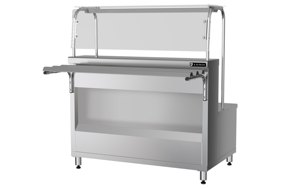 1500x705(1030)x1245мм. Высота до поверхности конфорок 500мм, 230В. Номинальная потребляемая мощность конфорок 3,18 кВт, номинальная потребляемая мощность светодиодного светильника полки 0,013 кВт, кол-во светодиодных светильников 1шт., кол-во конфорок 3шт., кол-во поворотных переключателей 3шт., полка 1шт., площадь поверхности полки 0,5 м2, нагрузка на одну конфорку 20 кг, противокашлевый экран. Время разогрева рабочей поверхности конфорки до температуры 400 С -20 мин. Диаметр конфорки 2200,5мм. Направляющие входят в комплект.