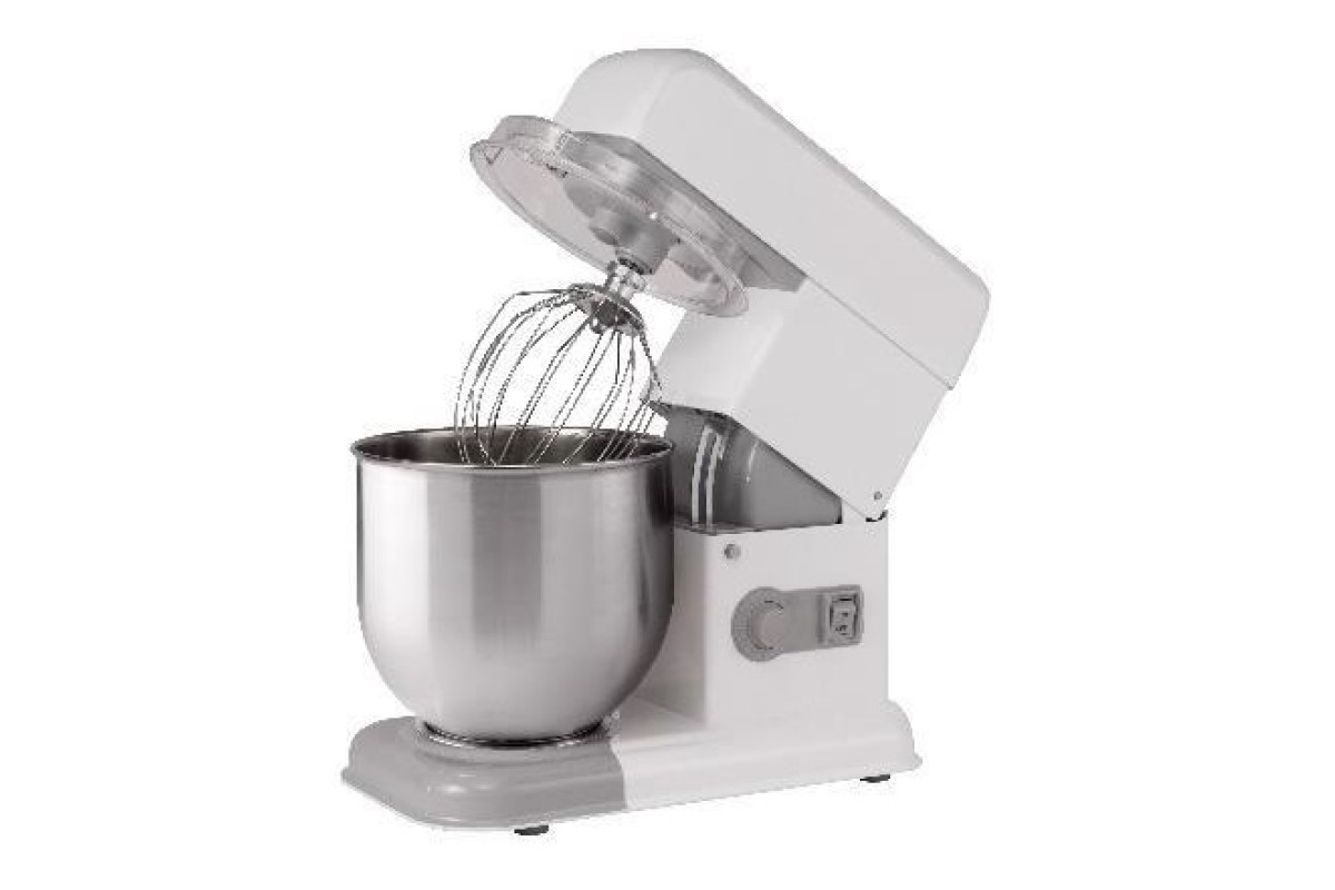 230x400x420 мм, 0,55 кВт, 220В, 18 кг, вариатор скорости, 7 литров, подъёмная голова, защита из прозрачного пластика, электромеханическая панель управления, скорости вращения насадок вокруг дежи 63/232 об/мин, скорости вращения насадок вокруг своей оси 189/696 об/мин, в комплекте: венчик, лопатка, крюк из пищевого алюминия