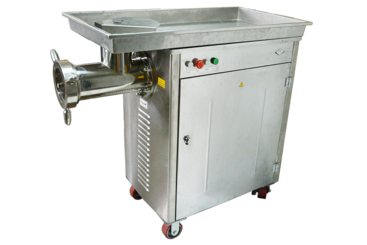 1225х600х1110мм,Мясорубка предназначена для измельчения кускового жилованного мяса, напольное исполнение, на колесиках, производительность 1000 кг/ч, объем чаши 40л, диаметр загрузочного отверстия 128 мм, передача ремень+цепь, облицовка, корпус мясорубки, шнек, гайка из нерж.стали, 2 решетки ? 155 мм, , отверстий 4,5 и 6 мм, 380В, 6,5 кВт, 215кг