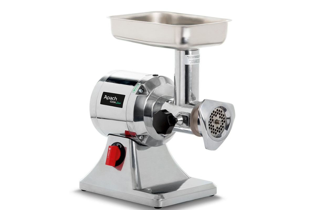 370x220х440 мм, 0,75 кВт, 220В, 200 кг/час, система ENTERPRISE (нож, решётка), диаметр отверстий в решётке 6 мм, стандарнтый нож, мясорубочная часть и шнек - пищевой чугун, нож и решётка - нержавеющая сталь, лоток и горловина - нержавеющая сталь. CE версия
