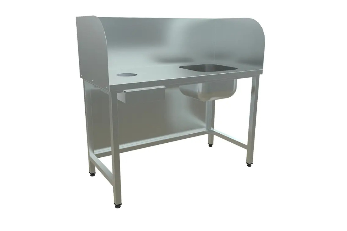 1500х600х870 Стол для чистки рыбы (столешница – нерж. сталь aisi 430, усиление ОСП, отв. Диаметром 150мм, выдвижной ящик под отходы, емкость 400х400х250мм, либо 500х500х300мм нерж. сталь. aisi 304, съемный борт 400мм с 3-х сторон, каркас каркас нерж. труба 40х40, сифон)