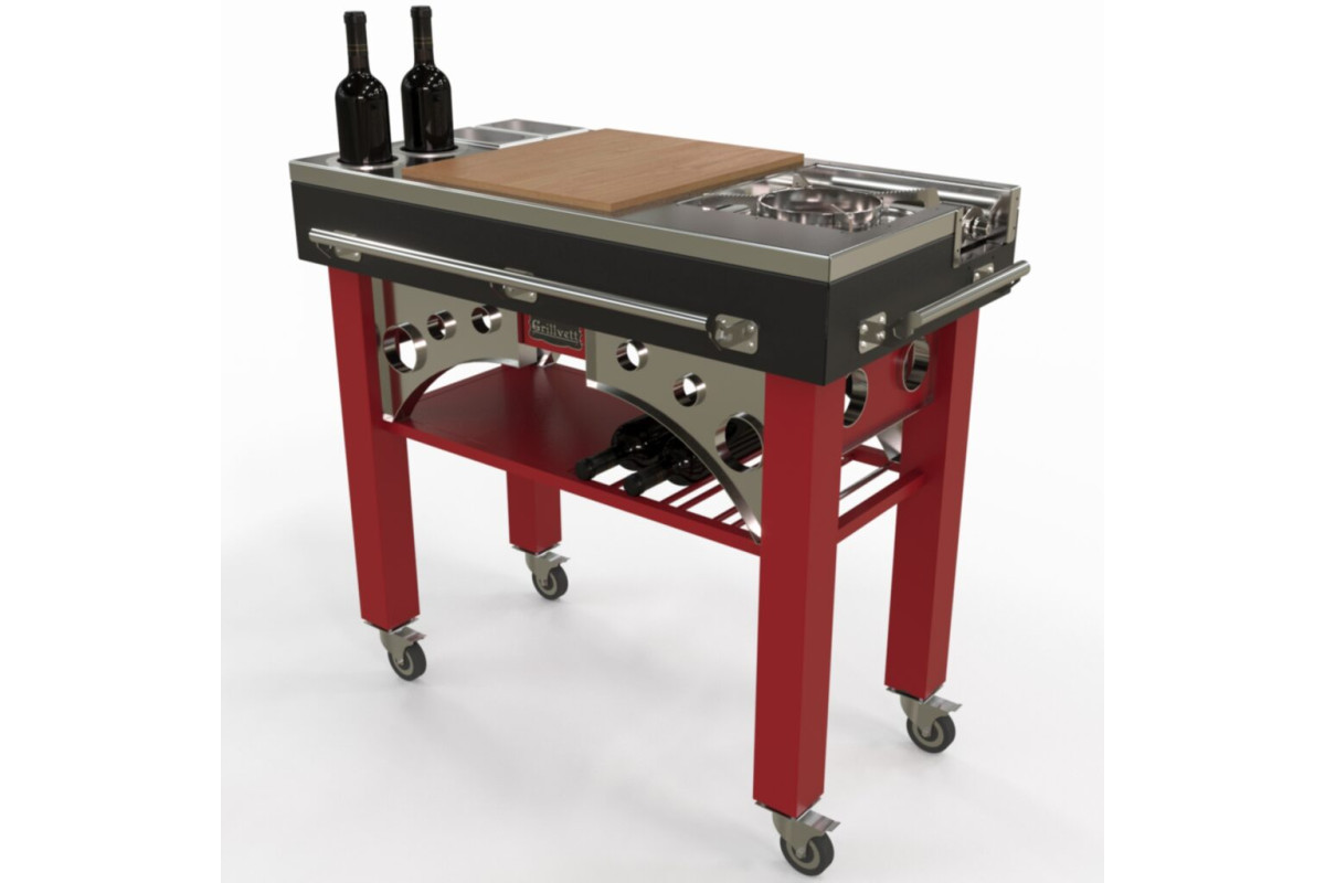 1060х620х870 мм. Столешница из нержавеющей стали AISI 304 c разделочной доской. Газовая плита с одной конфоркой (газ пропан или бутан, газовый баллон в комплект не входит) 2 отсека с гастроёмкостями1/9 Держатели для бутылок и мельниц Удобная полка под тарелки и бутылки 4 поворотных колеса с тормозом в комплекте