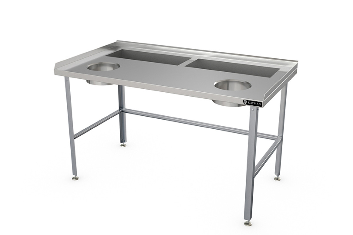 1500х800х870мм, нагрузка на столешницу 160кг, встроенная ванна 2шт., 2 отверстия для отходов, под которой помещается ёмкость для сбора отходов. 3 герметичных борта, высота борта 50мм, материал столешницы нерж. сталь AISI304 0,8мм. Материал подложки столешницы ДСП 16мм, каркас оцинкованная сталь 1,2мм, профиль уголок 40х40мм, диапазон регулировки опорных ножек 20мм. Вес 36,5кг. Изделие разборное и поставляется в удобной упаковке, что облегчает транспортировку и хранение.